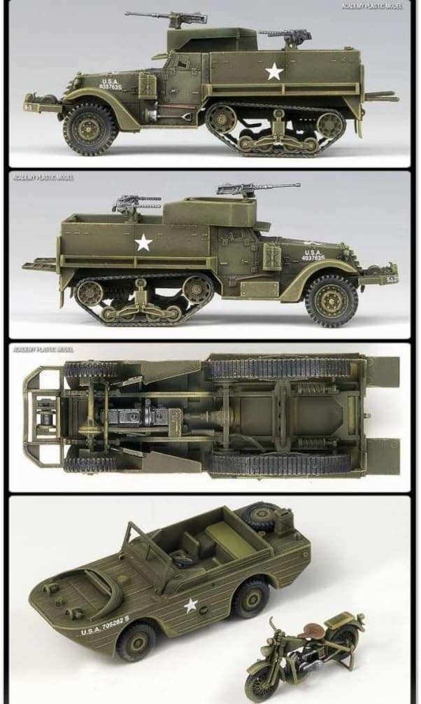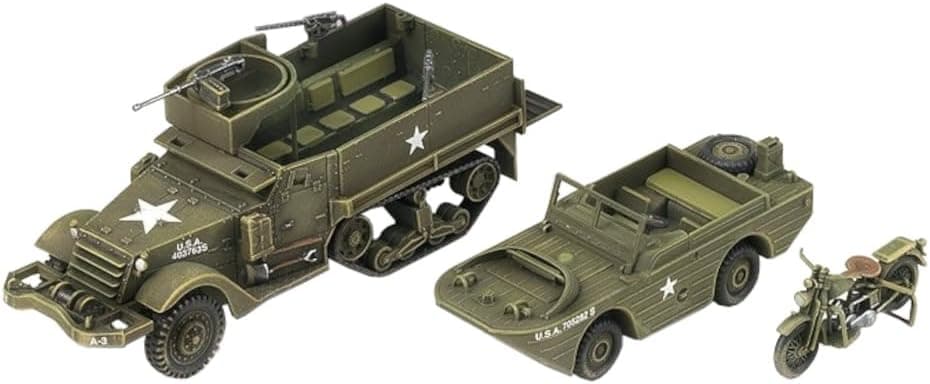 WWII Ground Vehicle Set 6 includes M3 Half-track, ¼Ton Amphibian Vehicle, Motor Cycle.