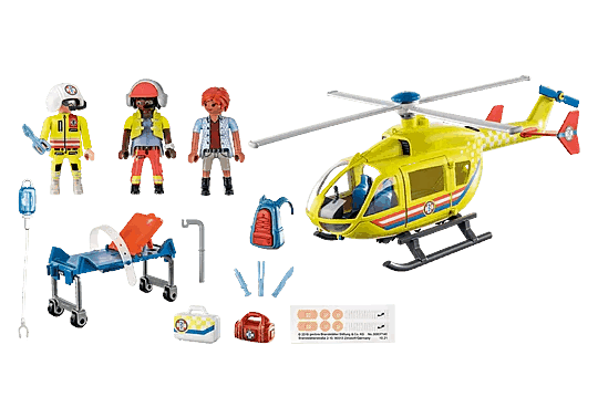 Figures: 1 rescue pilot, 1 female rescue copilot, 1 injured person; accessories: 1 rescue helicopter, 1 ambulance stretcher, 1 infusion with infusion tube, 1 set of first aid instruments, 1 rucksack, 1 first aid bag, 1 first aid kit, 1 label sheet with dressing material, 1 helmet with microphone, 1 visor cap, 1 headphones, 1 watch