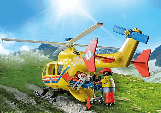 PLAYMOBIL Medical Helicopter with modern look! The injured hiker can be transported with the rescue stretcher. The rotor blades are movable. Dimensions: 36 x 13 x 16.5 cm (L x D x H)