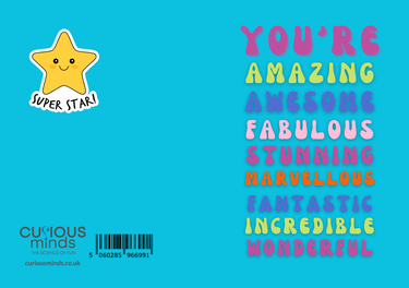 Front of card reads 'You're amazing, awesome, fabulous, stunning, marvellous, fantastic, incredible, wonderful.'