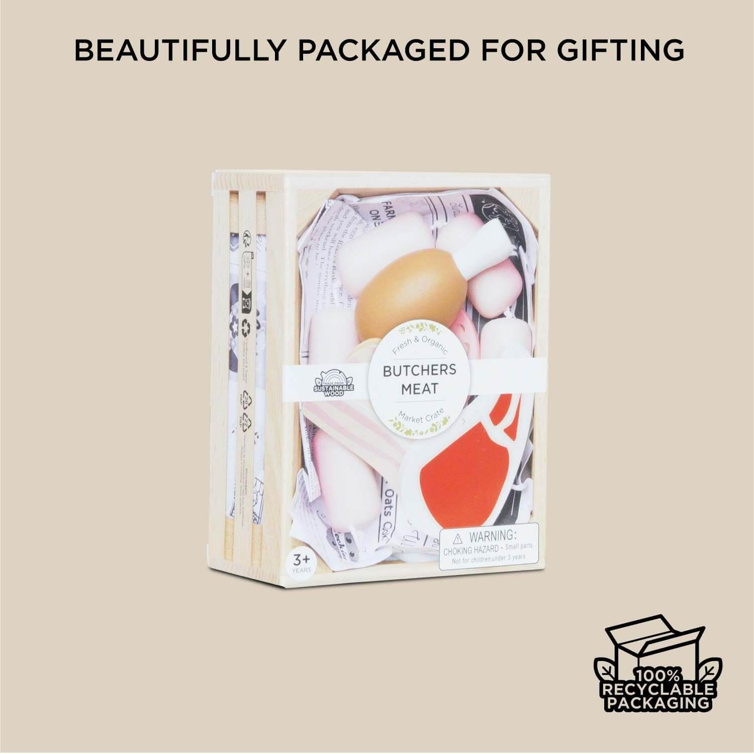 This Market Meat Crate is jam packed with delicious goods including a sausage, steak, chicken, salami & bacon pieces - all made from solid, FSC®- certified wood and painted using child safe, non-toxic, water-based paints. These tasty treats come in a solid wooden storage crate, with a newspaper style insert, for realistic play.
