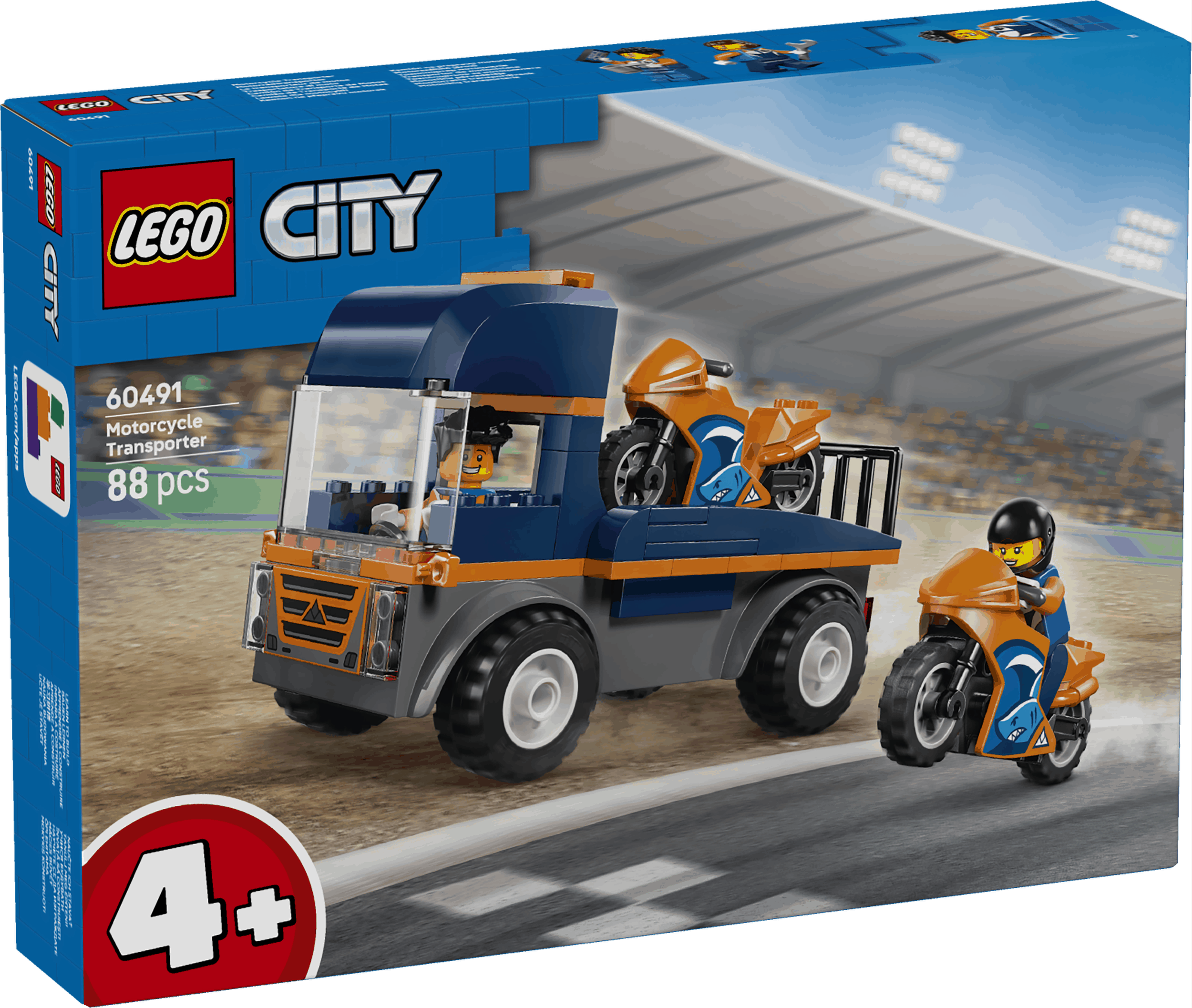Introduce kids to a world of imaginative play with the LEGO City Motorcycle Transporter (60491) toy for 4+ year old boys and girls. This vehicle playset includes a flatbed truck toy with chunky rubber tyres, 2 sporty motorbike toys and 2 LEGO driver minifigures with helmets. Kids can load and unload the motorbikes using the ramp, play out epic race action and seat a minifigure in the cab for fun on-the-road adventures.