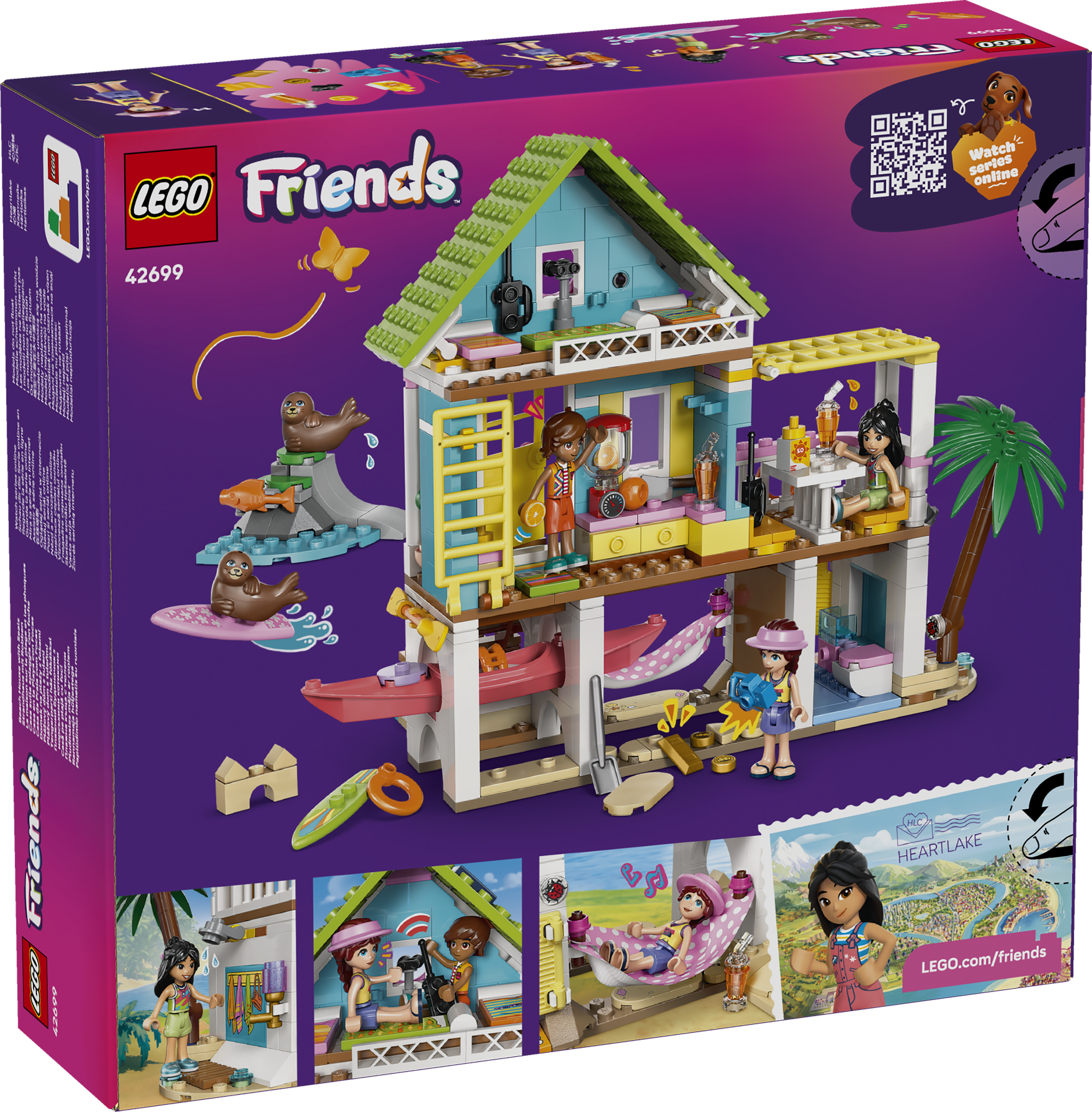 The LEGO Friends Beach House with Seals (42699) building toy for 7+ year old girls and boys, encourages kids to create fun holiday stories with a detailed beach house toy with 3 mini dolls, 2 sea-animal figures and lots cosy details.