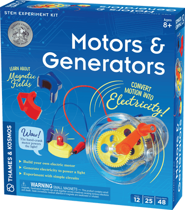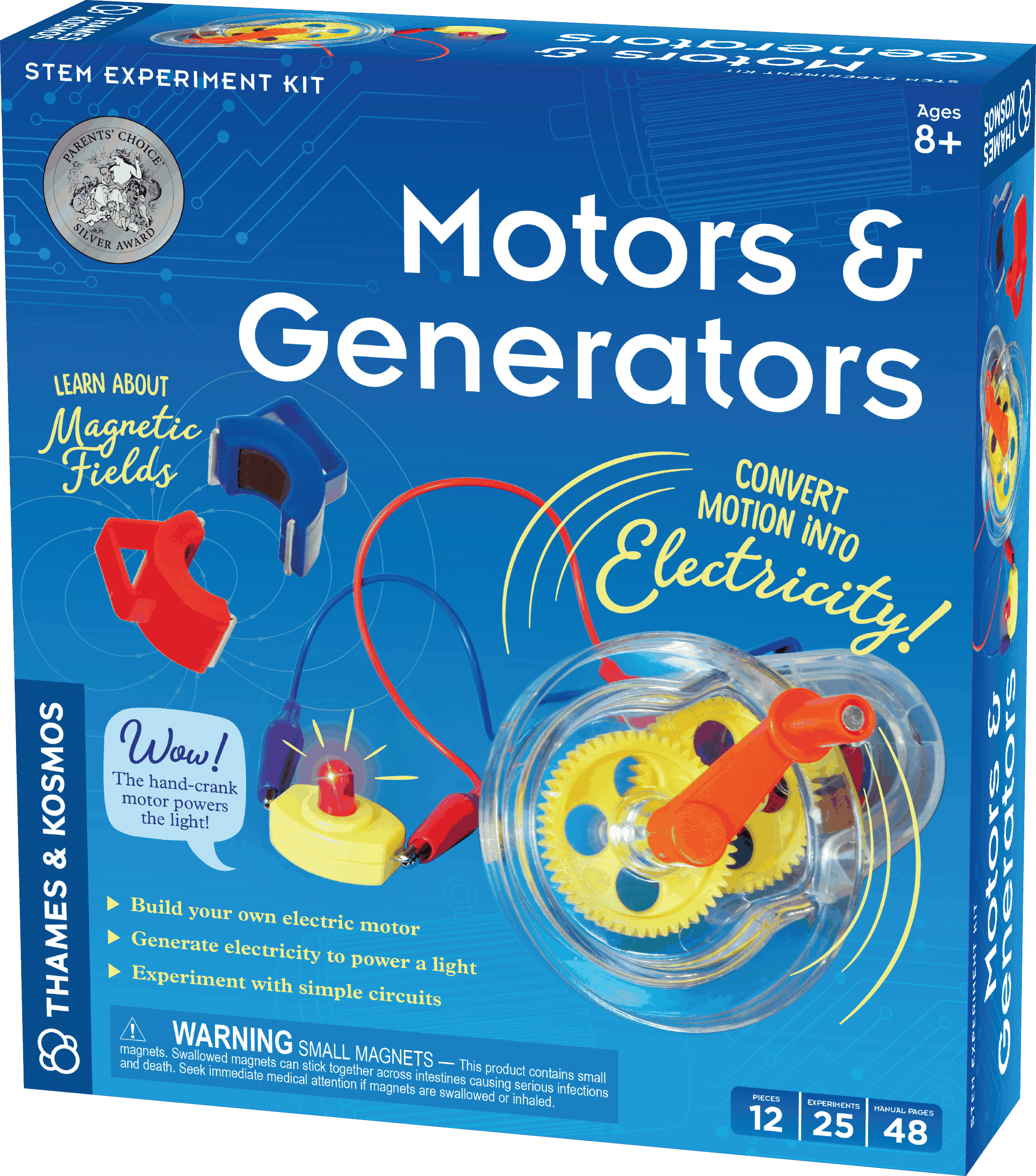 With this kit, you can conduct 25 experiments to learn how an electric motor converts electricity into motion, and how an electric generator does just the opposite, converting motion into electricity.